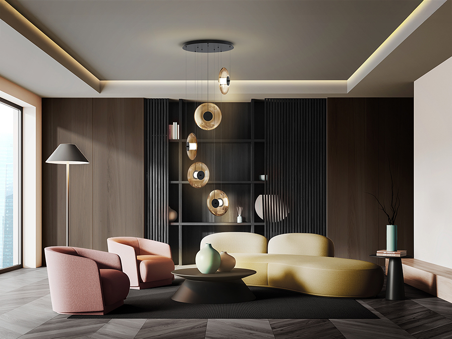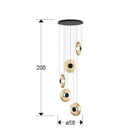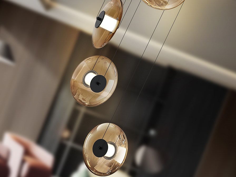 Lampa z kolekcji Diabolo wykonana z metalu i szkła. Szklane klosze w kolorze bursztynowym. 5 punktów świetlnych.