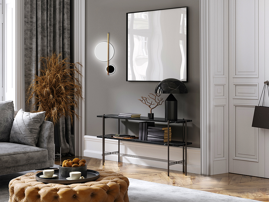 Wykonana jest z metalu, wykończonego matową czernią i bielą. Element łączący w kolorze złotym. Posiada opalizowany dyfuzor akrylowy.