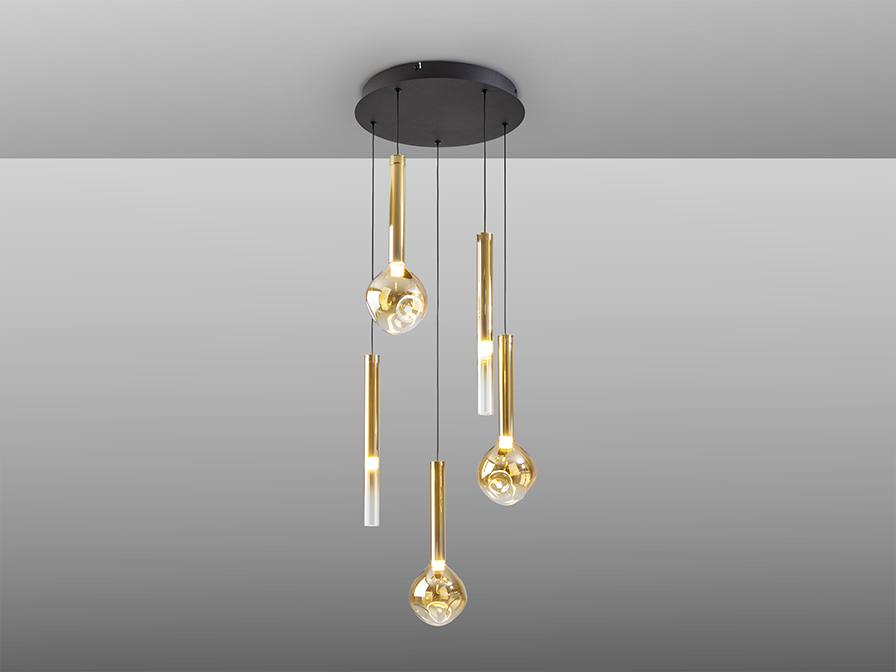 Lampa z kolekcji Essenza wykonana z metalu wykończonego w kolorze złotym. Klosze z przydymionego szkła w kolorze złotym, przechodzącym w transparentny. 5 punktów świetlnych.