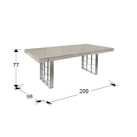 Stół do jadalni wykonany z płyty MDF w kolorze popielatoszarym (lakier połysk) z ozdobnymi rowkami i chromowanymi akcentami. Metalowe nogi pokryte matową farbą w kolorze srebrnym matowym.